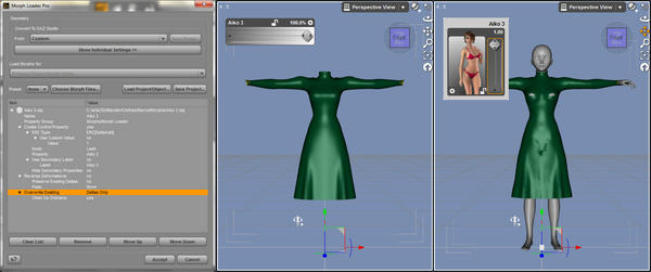 Also, once your morph override is complete, you might not see any change in the dress. If this is the case, select "Genesis", and then move the "Aiko 3" slider slightly away from 100%, and then back to 100%. The dress should snap to the newly imported override MT.