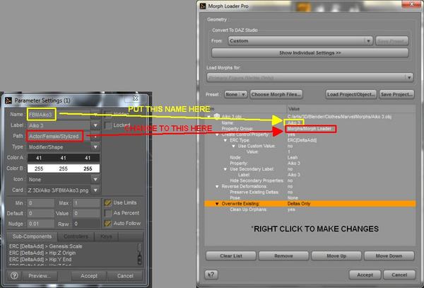 So I can get the morphs in, and they have the right names, but they don't seem to be linking up right, when I have the dress selected, I can dial the morph I made and there it is, but when I fit the dress to Genesis and dial up her shape, the dress still has the auto-generated shape instead of my morph.