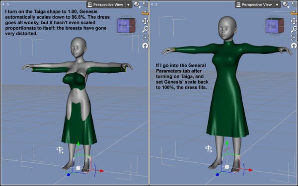 So there are some shapes that automatically rescale Genesis, like the Basic Child or Aiko 3, I figured out quickly enough that with those ones I need to go into General Parameters and bump the scale back up to 100% before I export the OBJ model, if I'm going to be fitting morphs for them, and so I got the morphs for Aiko 3 and Basic Child to work just fine, but I have Taiga (http://www.daz3d.com/taiga-for-genesis) which rescales to 86.8% size, and this one is doing something else weird that I can't figure out. When I put the new morph into the dress, and then dial up Taiga, the dress gets all warped and squishes. Here's pictures:
