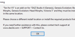 Hi. I have DAZ Studio, Genesis, Evolution Body & Head Morphs, and Victoria 5 installed. I'm trying to install characters like Tori and Gabi for V5, but every time I try, I get the following: