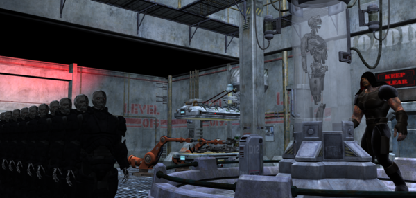 Thanks Kharma. :) I do have a specific lighting suggestion- I'd go for highlighting the man on the right, bring in a spotlight at about 10 o'clock high and go to the side (toward us) so it is hitting the chamber and the man from the side. You'd have a great shadow on the opposite side, but that would highlight the action. The man is the one doing the activity. For the line of figures, I'd do a point light or spot light with a softer intensity, shining from straight above and up quite a distance, then another from the direct front (again, elevated) with a bit stronger intensity but not striking all the figures. You'd get a nice gradient effect that way.