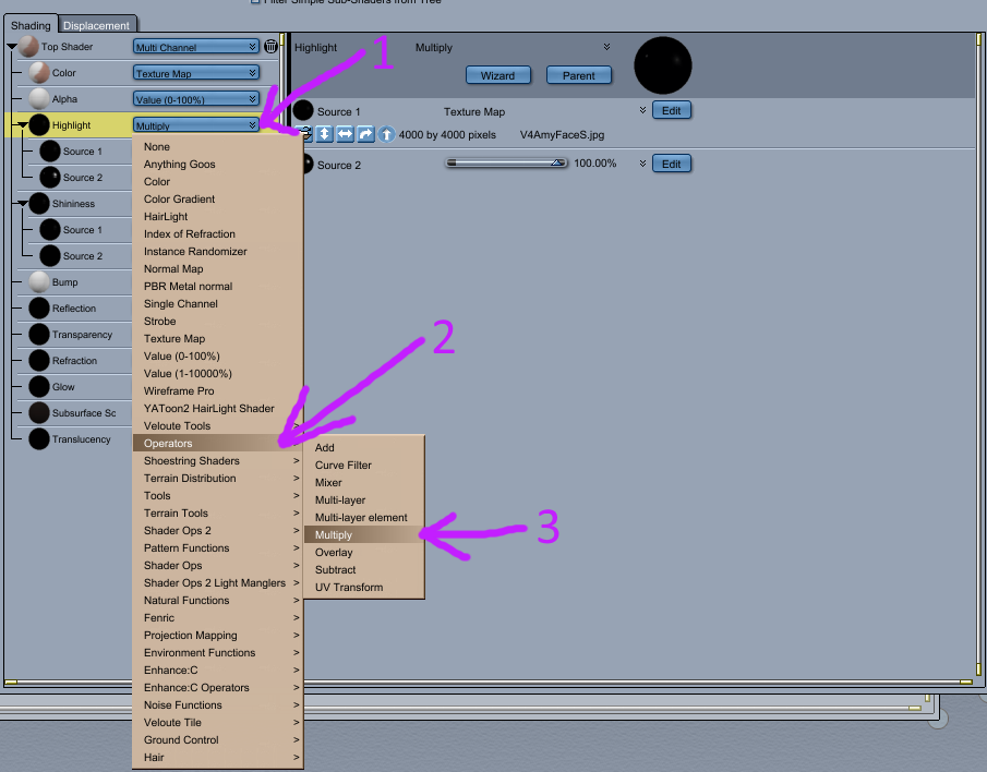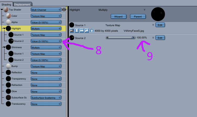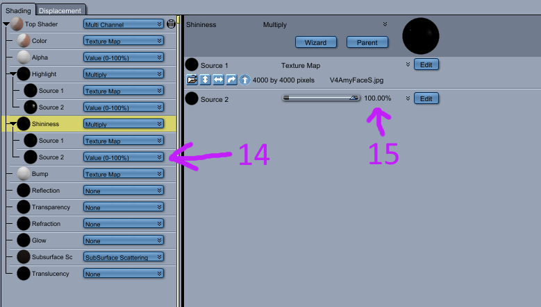 1 to 3 Repeat steps 1 to 3 to set up Shininess