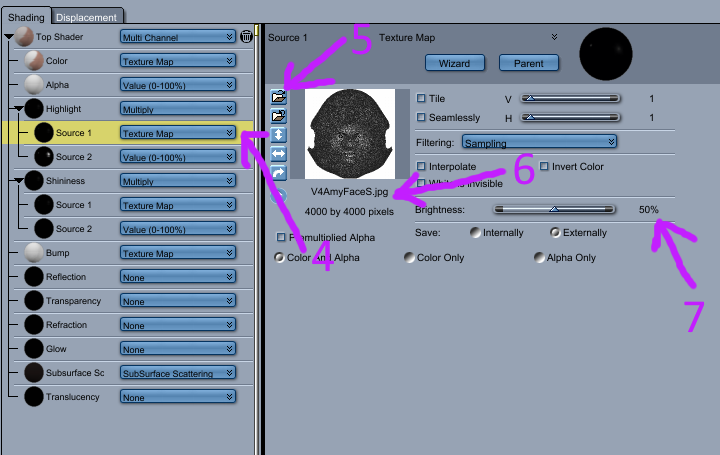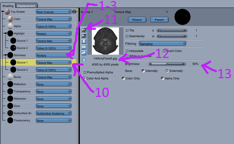 Ref the missing Highlight and bump maps. If I load the colored face texture which options (color and Alpha or Alpha) do I use?