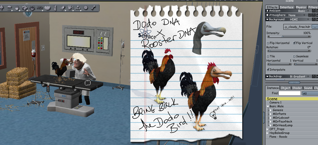 then I set up a scene with a mad scientist ( there's always a mad scientist ) in his lab working on the project to bring back the extinct Dodo bird ( he failed miserably ). I used a plane to use the combined Roodo PNG image to show him up on the table.. I also modeled the straw bales, glasses and scatters the other day and used them.
