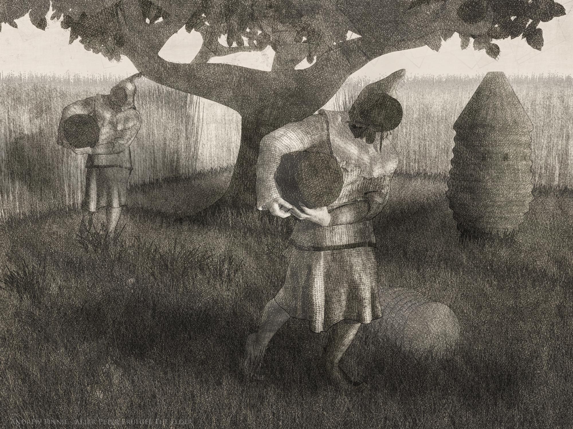 This work is modelled vaguley after The Beekeepers and the Birdnester by Pieter Bruegel the Elder , 1568.