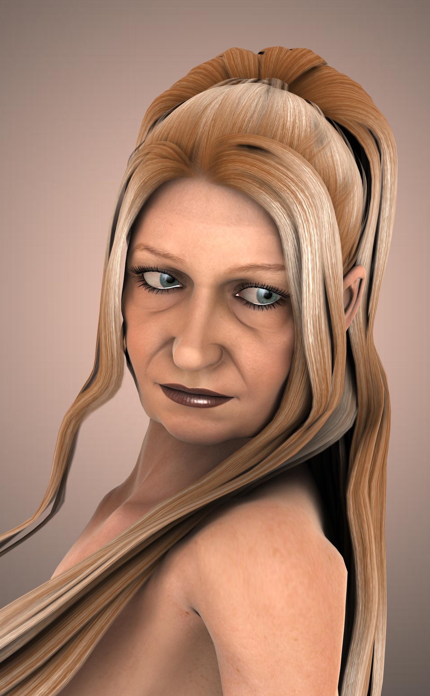 OK, time for another custom dial-spun character, based upon G3F in this case. This is the result of attempting what I believe to be one of the more difficult morphing tasks, to create a character based upon a real individual. It can be a painstaking and occasionally frustrating exercise. The key to peace of mind is not to become too obsessed and knowing when to say, "Close enough!". Created completely using morph sliders in DAZ Studio, rendered in 3Delight. Click on the thumbnail for full size.