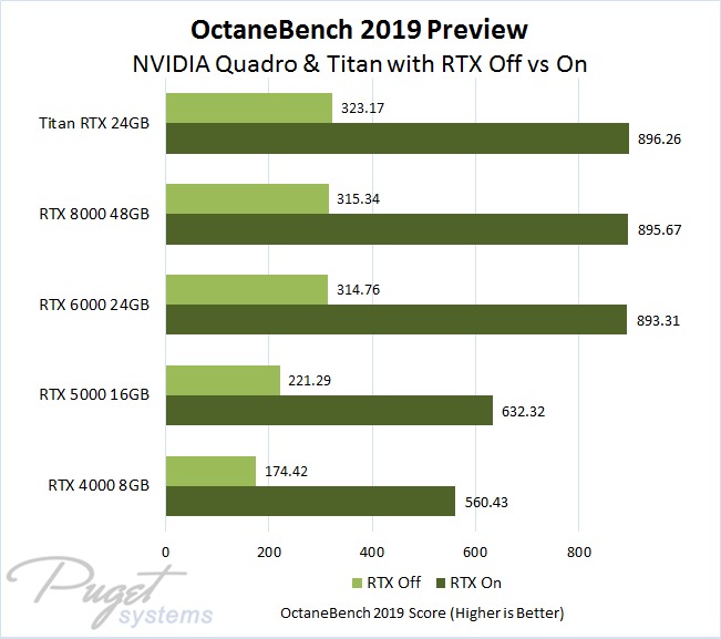 Some new benches.  Octanebench shows up nearly 3x faster with RT enabled.