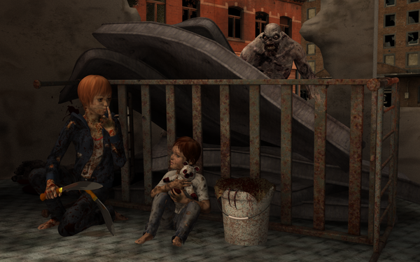 This image has that creepy monster guy lurking around looking for someone to eat up and that kid looks like he is on his menu... but it's the teddy bear that creeps me out along with the orange haired chick who reminds me of someone I once knew!! but that teddy bear!!