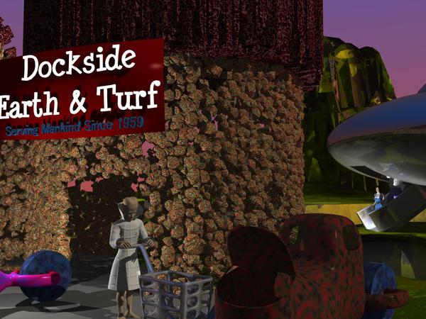 Alien food store is a vertex object (made invisible) with various shaped primitives replicated on the surface and shaded to look like alien construction materials.