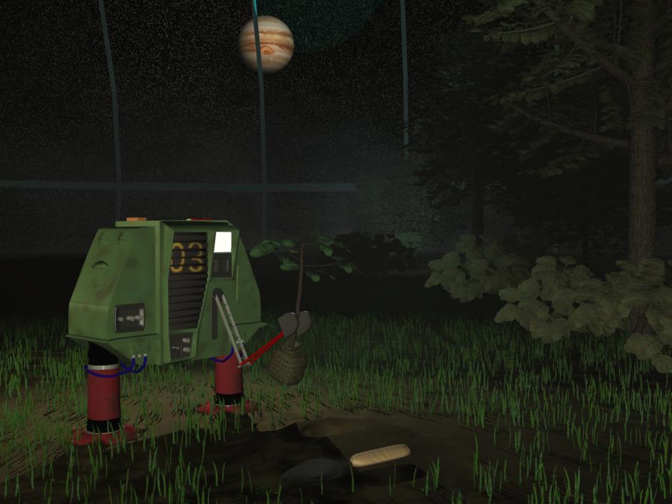 Here is my old Carrara project. It had the robot inside the forest dome. For Bryce, I am working on a scene with a robot repairing the spaceship exterior with Bryce trees in a space dome in the background.