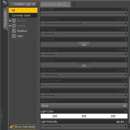 I'm just not seeing ANY options in the parameters tab beyond light intensity and light color. I turn on hidden properties and nada.