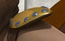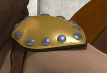 So...not the intended use, I believe, but it was fun to re-texture. I primarily used the Hardcore Utility pack's 'Hammered Steel' for all the metal bits and bobs (except hammered brass on the top zone of the pauldrons), and Leatherize for the rest. (Suede where it touches sensitive skin as much as possible (and pockets), worn leather for large flats of material, new leather for the laces and a few other small pieces.) Also the veil is Sheer Greatness. Oh, and the bra is Hongyu's bikini, of course, with suede main and leather straps.