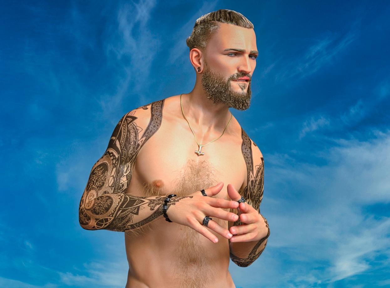 It is https://www.daz3d.com/koryan-top-braid-hair-and-beard-set-for-genesis-8-males by Neftis!  I thought it had a nice Nordic look which meshed with his angularity.