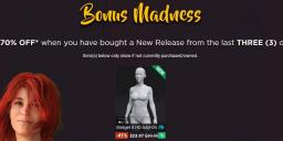 This has been the best day so far for me. Well, after snapping up a 15% off gift card yesterday. Bridget Pro + HD add-on + Edie and Mika Pro Bundles, Lucas 8 and Owen 8 HD add-ons, a handful of other items. Worked out to like $640 for $130, which I used with store credit from my $200 gift card from yesterday (that only cost $170). So if my math's right, probably only $110 of real money for all of that?