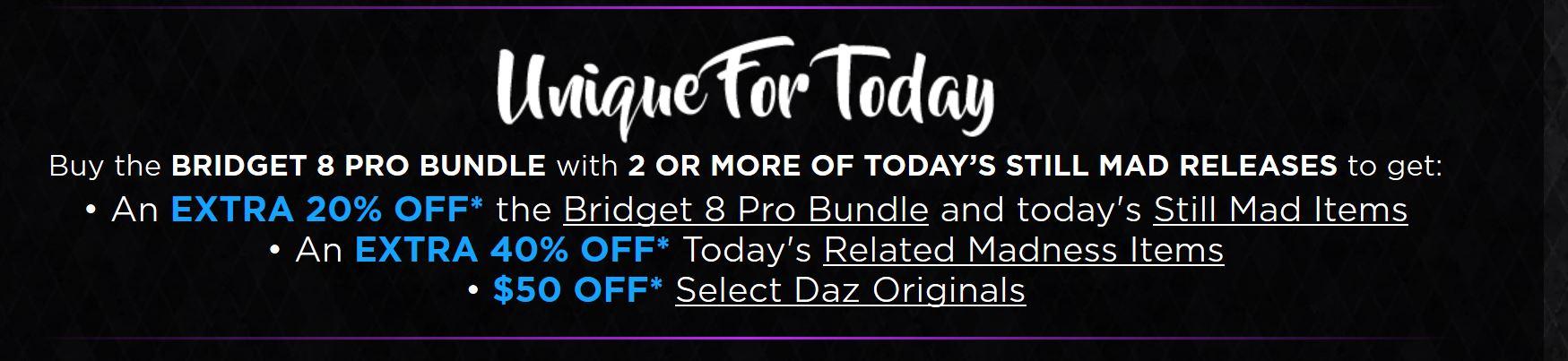 1. Everyone who purchased the Bridget Bundle during the first couple of days should get the same extra 20% off and extra 40% that everyone got today and the days since release. They could give us a special banner and link to those pages specifically for early buyers.This would include getting more bang for our buck for the $50 Daz Originals which are now cheaper for late buyers.