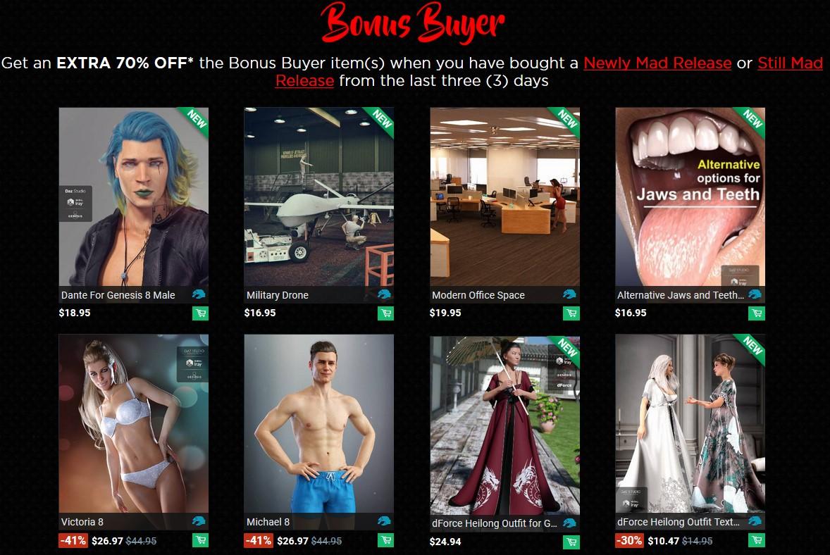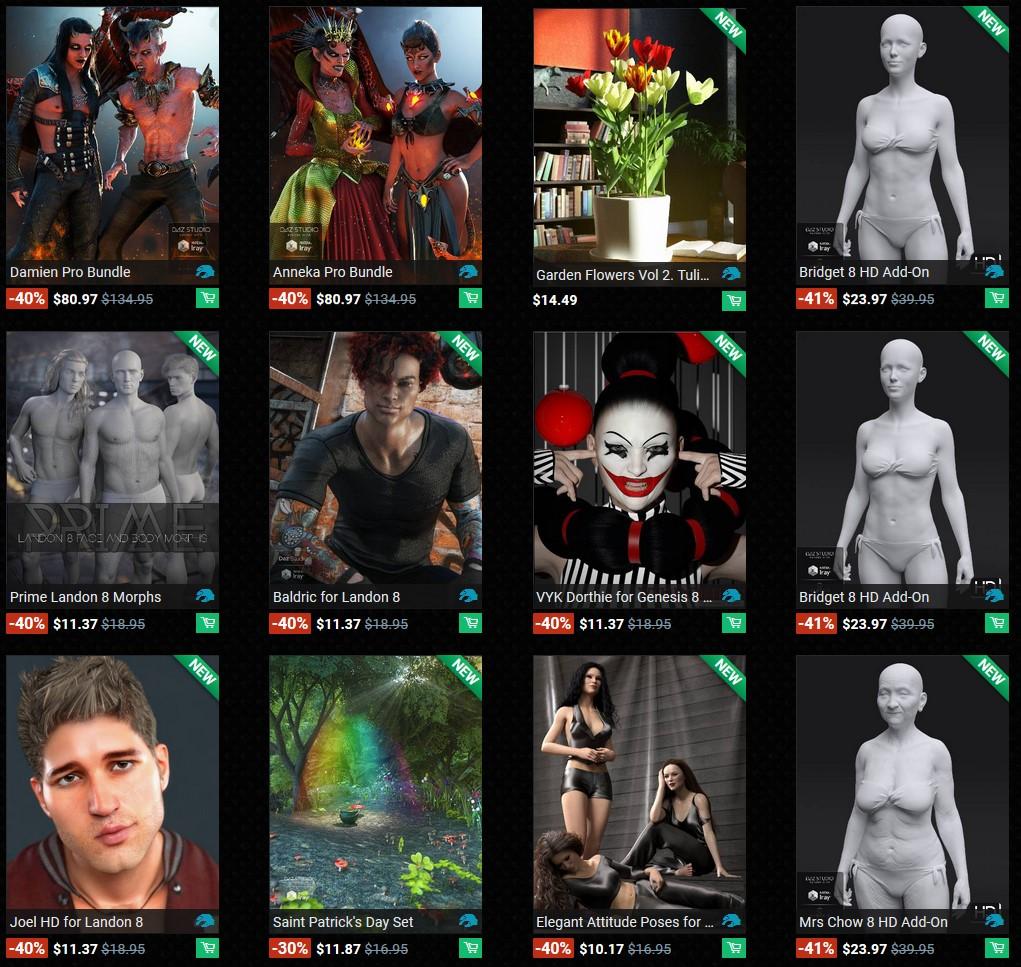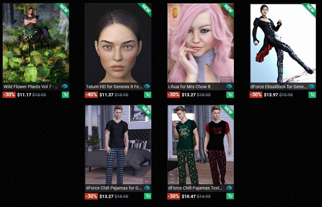 Never was able to get in on a lot of the extra savings or special/free items as I don't bother with figure Pro Bundles and save for the Tulips, the 70% off bonus item tended to be either G8 or dForce oriented (which essentially is G8).