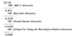Hmmm...yeah, I've got Mr Woo plus 4 related Mr. Woo items, plus Annaku, plus the Tomes, plus I own 3 of the key items (I'm assuming I only get one 10% discount from that), plus I have a purple banner for 10% off everything in my cart.