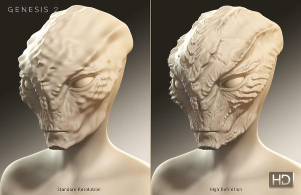 With the release of the Creature Creator HD for Genesis 2 Female(s) morphs we are also introducing our latest addition to DAZ Studio - HD Morphs. Previously content creators could only sculpt morphs on the base resolution of a SubD figure. Now, with our new HD technology content creators can sculpt their morphs at any mesh resolution they choose. This gives content creators the ability to sculpt fine detail into the mesh of a SubD figure that was previously unattainable.