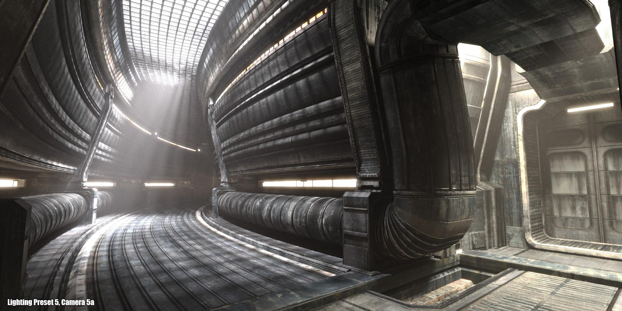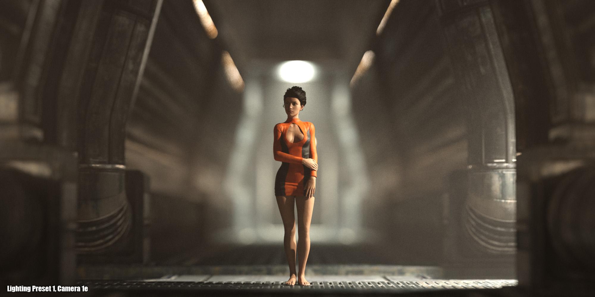 A dark and spacious Sci-Fi corridor environment. Includes 28 camera presets and 8 lighting presets.
