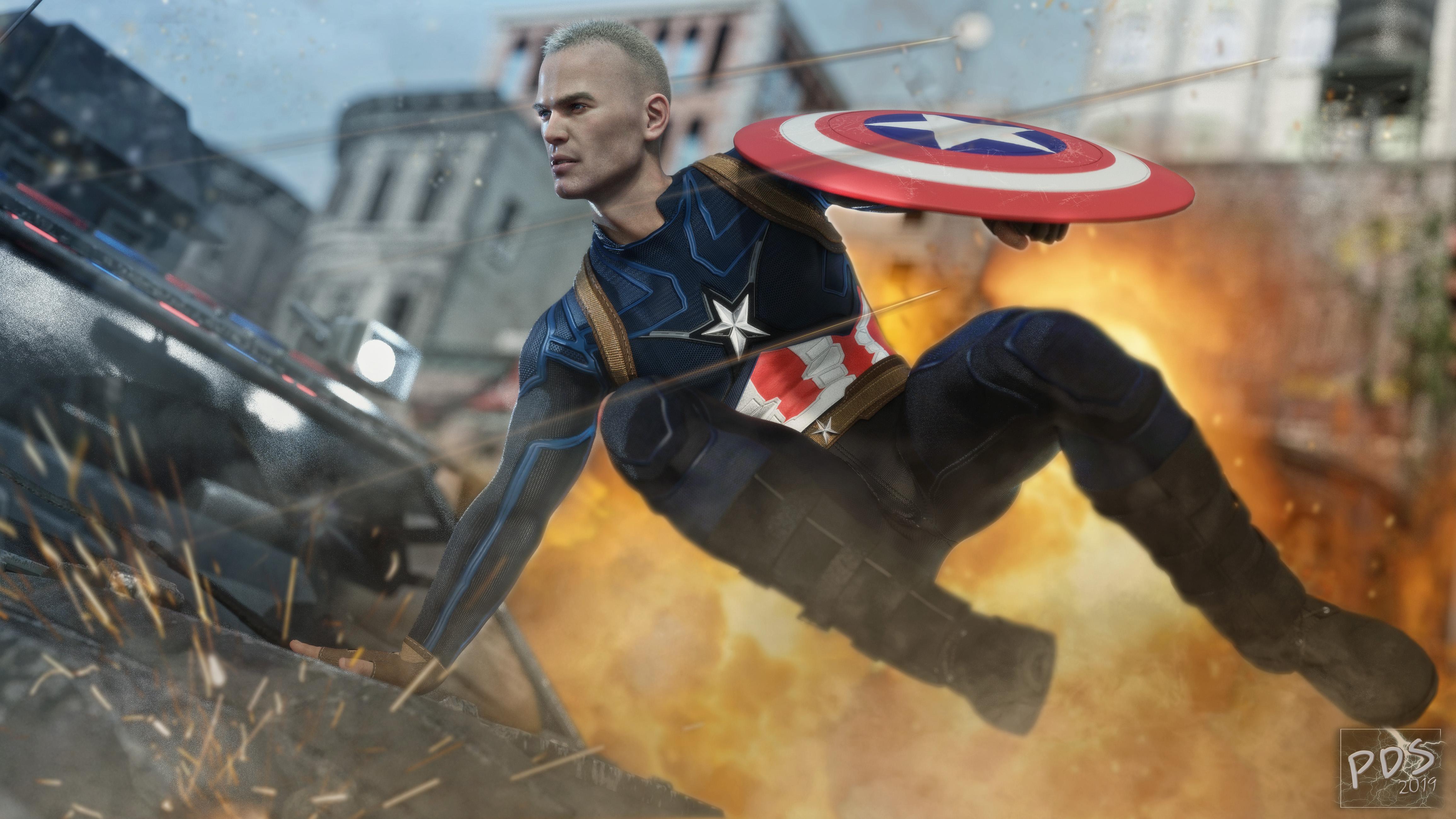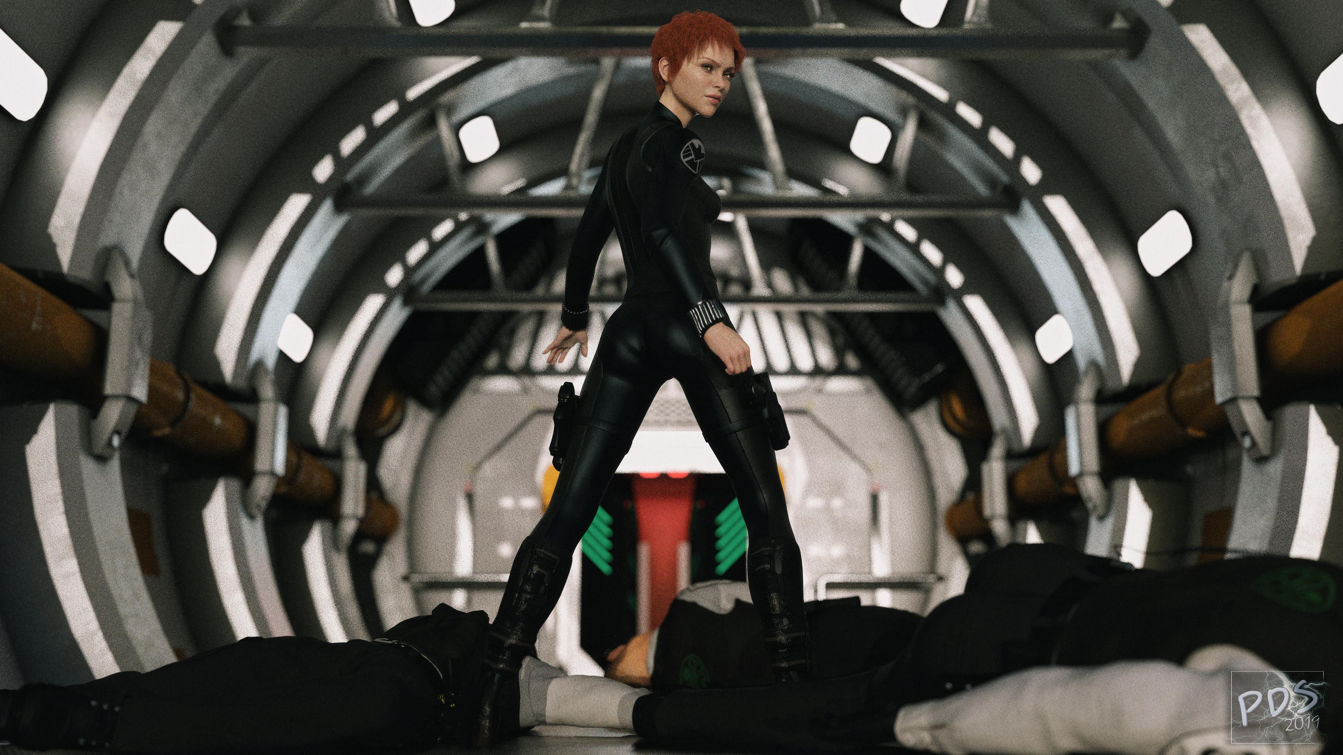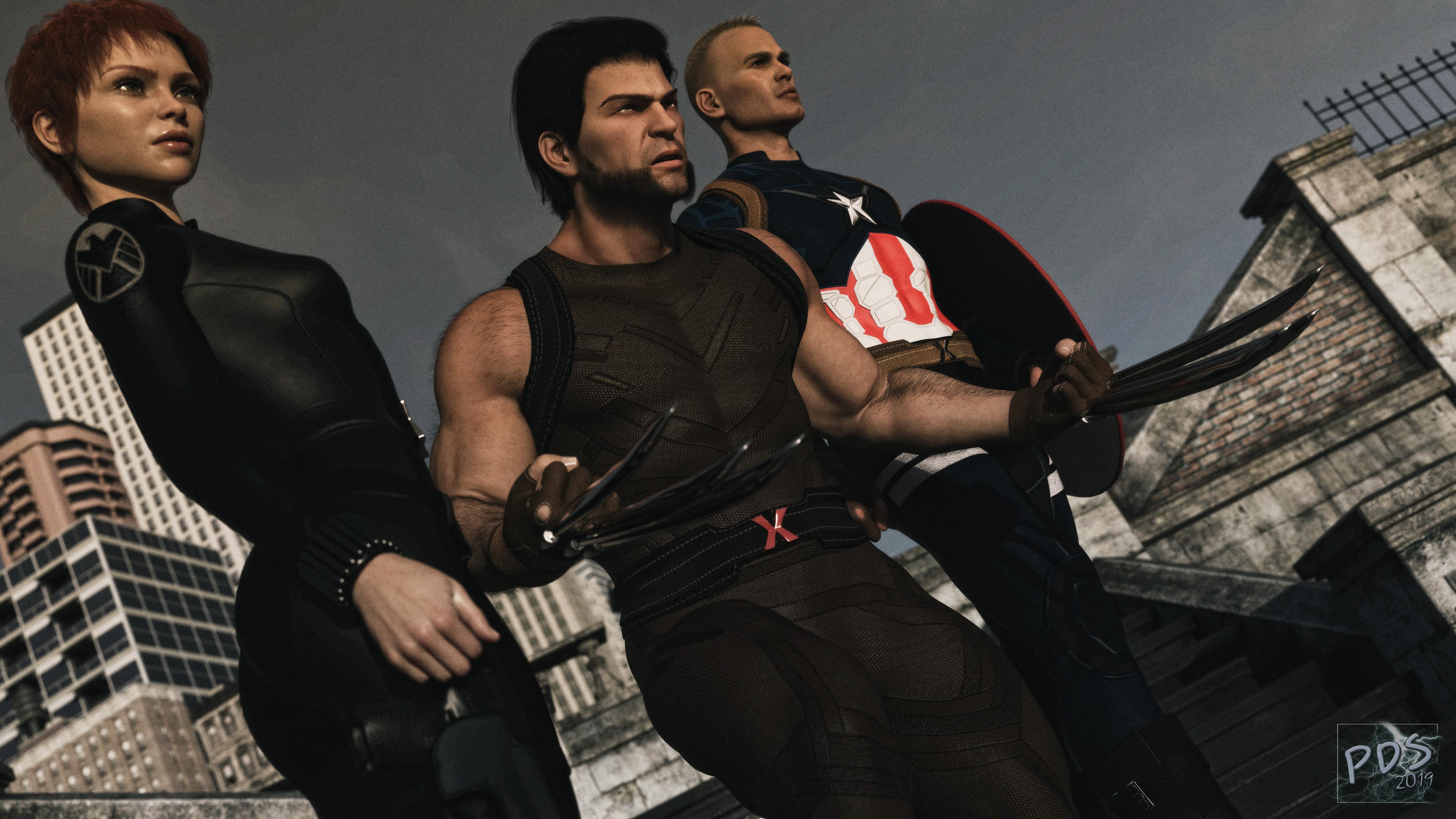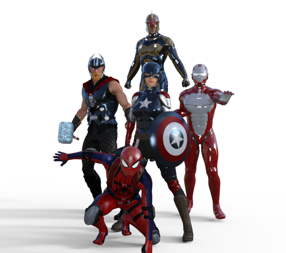 Very cool character designs. Also, the classic "team pose" catches the vibe perfectly (love the dramatic Spidey up front). The lighting is okay, but seems to be making things a little shiny for my taste. Nothing front with it, though, and I do like those nice, long shadows. I would suggest watching out for tiny details, such as the placement of Nova's foot. We can see his toes between the woman's legs and, welllllll, that's just not the sort of small buldge I would expect to see down there. This could be resolved by moving Nove a bit to our left or just bending his leg back.
