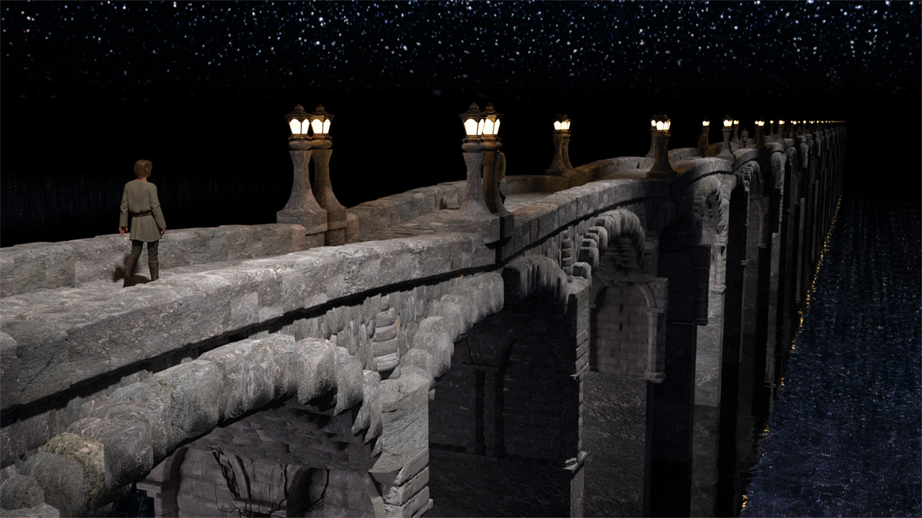 Bridge extension. Notice here that you cannot hide figures/objects from being reflected except to hide them behind other props. In this image, on closer examination, you can see the figures reflections. Use the AuxView Port to help move things around until they are hidden.