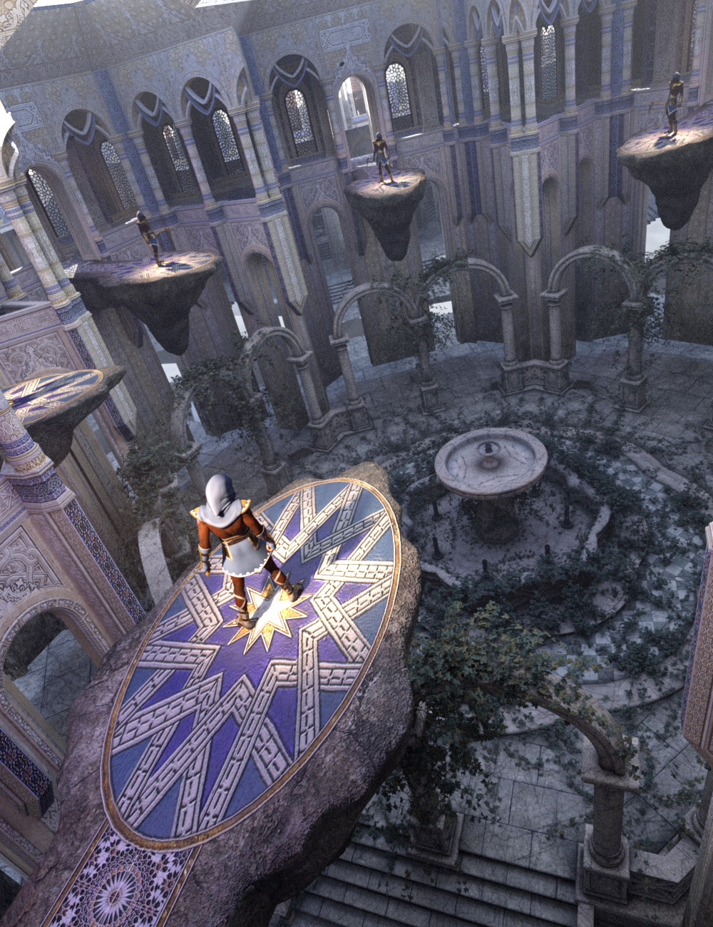 My first experiment with K-scope was with Cista Sanctus. I wanted an infinite set of collumns, and failed. What I did get was a kind of courtyard beyond the main architecture that I loved. So then I had to evolve the image, and this is what I got. It grew naturally from my original mistake, and I'm very happy with the result. Love the product, pure and simple.
