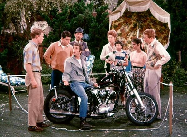The funny thing is that th chop job on the HD does not really fit with the time period for Happy Days, the Triumph was a better period piece.. To many details on the HD that are from the 70's style of chop.. A bobber look would have been more to the point. (and having been a biker in the late 60's, well)...
