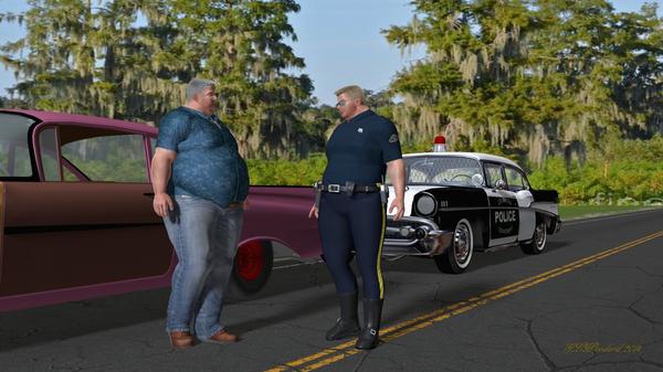 Officer Stadanko; "I know how important donuts are Kenny, but I gotta tell ya, the department has hired a couple a new recruits, and these guys, they be clean shavin' and all, and if one o them get ya, they got ya, know what I mean? So just do me a favor, I know I been lettin' ya slide all these years, good grief boy, you ain't had a drivers license since the last one got suspended during the Reagan administration! Now just do us both a favor, and at least get a license plate on this rolling wreck! and get some insurance too! You know its the law!"