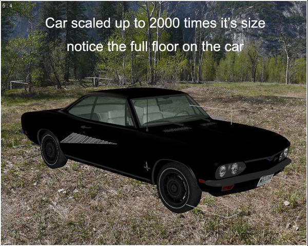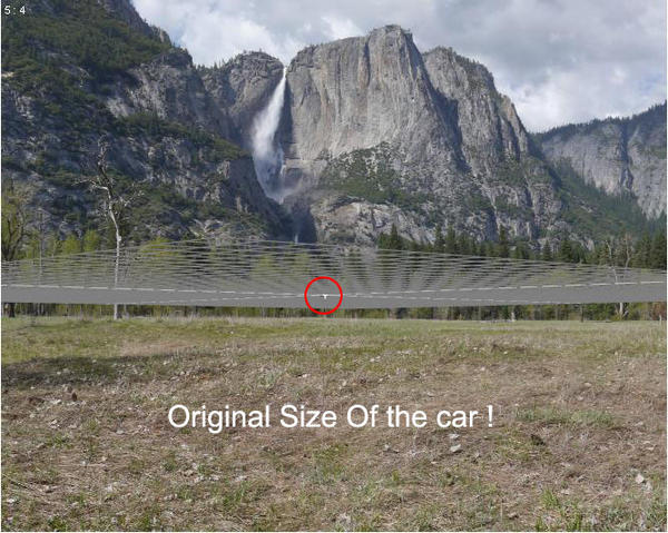 Well if you look, the car is up on a hill and very close to the camera. The waterfall is way in the background. This will make the car look bigger. I wanted most of the attention on the car, not the background. I tried zooming the car back, making it smaller, but then it looked like a toy car...lol. Also, with the Yosimite set up, to capture more area, you have to zoom back over and over just to get any sky included in the scene, to the point where the floor is a tiny spot, I would have to scale the car up like 5,000 times it's size. That is the only throwback to the set. Here in this render, it is already scaled up over 1,000 times it's size. You can rotate the scene just fine around the circle, but you can't zoom in or out very easily. If you zoom back too far, it will go outside the sphere. The envsphere works much better for zooming.