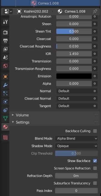 After exporting again from Blender as .OBJ, I got the following material for Cornea