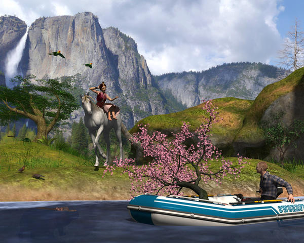 Uncle Stefan was right. It would be too hot for my cherry tree next to the fireplace. I'll float it down the river to find a nice pastoral setting where my tree can thrive... Look! Here's a fantastic place! That exotic woman is beckoning me from the back of her unicorn. And up in the air - a couple Carolina Parakeets! On the ground - a pair of Passenger Pigeons! Everyone said all those birds were extinct. Can this be real?