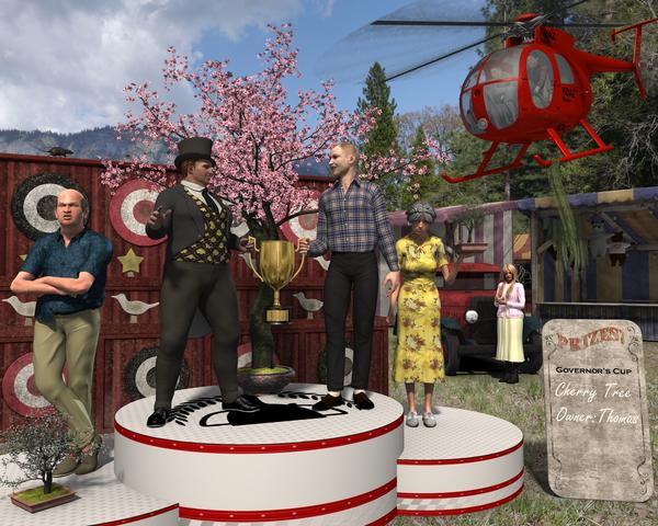 Next Day at the State Fair: As the media swarmed in by land and by air to get the news, Thomas' Cherry Tree was judged best of show. His disgruntled former bonsai club members fumed and pouted as Thomas was awarded the Governor's Cup. His Cherry Tree would be displayed in the Governor's Mansion, and Thomas had an open invitation to visit it any time.