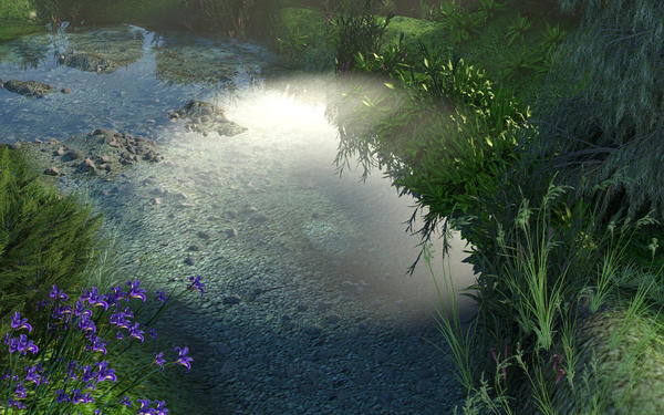 My last pass was to take a stab at godrays. I like the direction the sunlight is trying to head, but it needs more godray-ishness and less spotlight-ishness. And maybe a little morning mist around the corners.