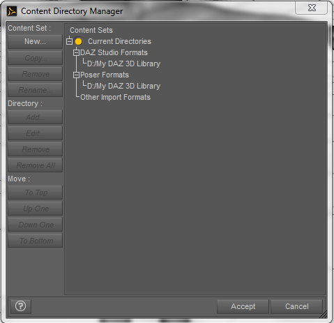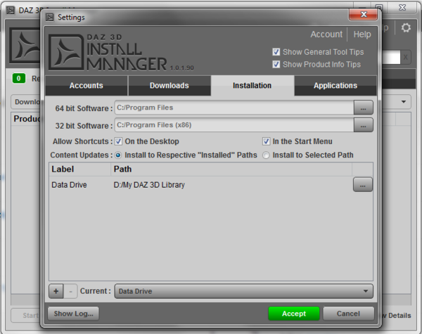 One last note: those two paths in DIM and D|S don't need to be set to exactly those locations, or even the default locations, they can be anywhere that's an allowed location for program data (e.g. for recent Windows versions, anywhere except in a Programs folder). The only important thing is that they must be exactly the same. This comes in handy if you can't install to your system drive, maybe because it's too small to handle multi-GB of DAZ goodies.