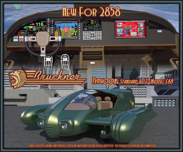 2858 was the model year that marked the point at which Bruckner Aircars joined the mainstream of contemporary aircar manufacturers. Previously known only to hardcore explorers and adventure seekers for their rugged ex-military Hummel II and Dragonfly models, The Typhoon would change that image and open new markets.