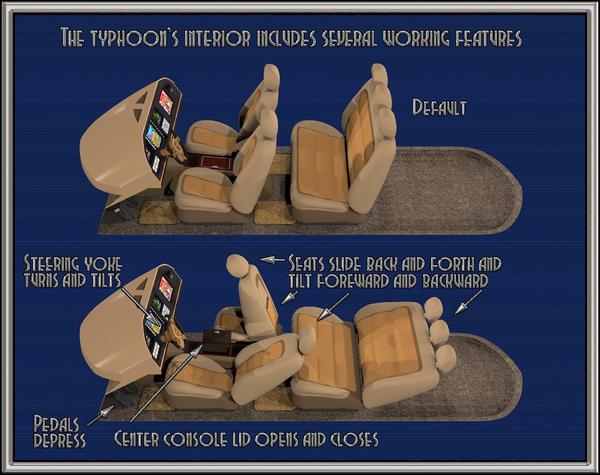 The Typhoon, actually a "Civilized" model of the Hummel (Bumblebee), for the first time offered soft cushioned seats and modern instrumentation, as opposed to the Hummel's sparse and utilitarian appointments. Although, as Larry Wright of Popular Aircars Journal noted in his 2858 review of the Typhoon- "You can still hose out the interior if you need too, yet maintains its rugged comfort". The all-weather interior was a concession to its open T-bar roof design, although later "Deluxe" models would sport the less popular "beetle wing" fully enclosed canopy. New too, was the long list of available factory colors, a far cry from the six drab military-esque colors available on the Hummel II.