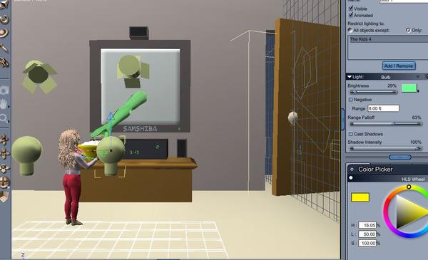 Credits - there are two The Kids 4 and one of the kids currently has Tatiana hair (which will probably be replaced with strand hair from the hair room). Everything else was made in Carrara. Splines include - the old TV and its components, the frame of the new TV, the wavy blanket (which I replicated similar to the sea that FD made in a prior contest), the door and walls, and the bowl for the popcorn.