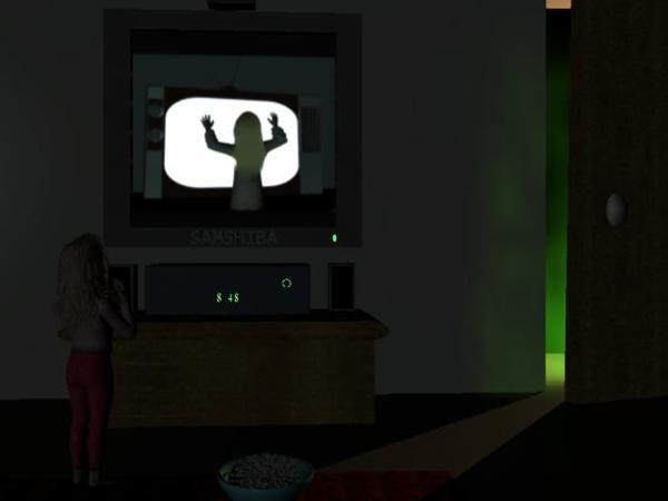 I've added some lights on the left to show the girl a little better and added a spot light on the TV screen (and added an ominous greenish poltergeist arm). What do you think?