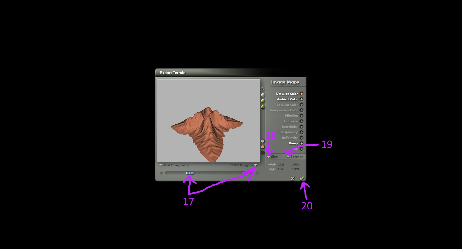 17. An Export Terrain tab opens. Use slider if wanted to increase number of Polygons. WARNING - if you increase too much Bryce will fail