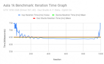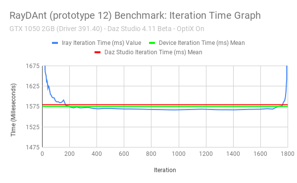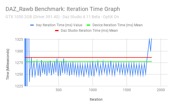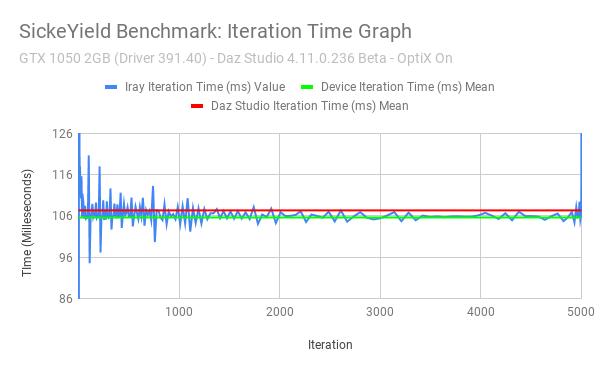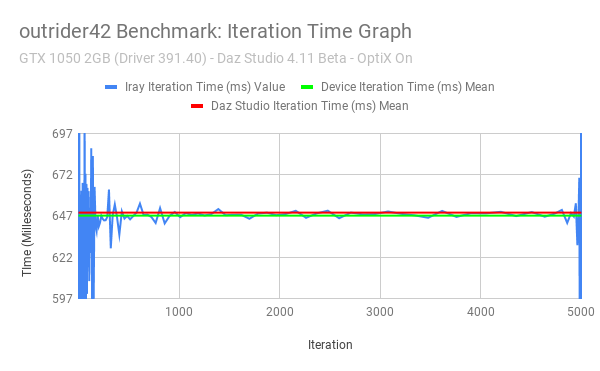 These are Iteration Time analyses (the unbiased renderer equivalent of Frame Time analyses from the game benchmarking world) generated by me from info contained in Daz Studio's log file (more on how to generate these for yourself in a future post) for individual runs of each benchmarking scene currently making the rounds in this thread, as well as the benchmarking scene I am currently in the process of beta-ing. There's a lot of important/useful information to be had in these graphs. However the main thing to be seen here that's relevant to your point is just how diverse each scene's pattern of Iray Iteration Rendering Time is despite ALL variables (including environmental and procedural - Daz Studio was fully closed and freshly reopened before rendering each of the scenes) except which scene was loaded being kept identical. These graphs are an objective quantification of just how much of an effect scene content/composition has on rendering performance - not just in terms of a single simple statistic like Total Rendering Time, but also in terms of what goes on with Iray under the hood on an iteration by iteration basis.