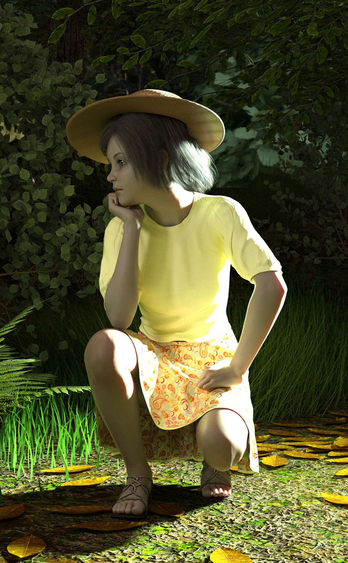 I was working with a new character today, JingLing and she comes with her own hair, called 'Lively Hair' and put her in X-Fashion Bohemian Casual Outfit with sandals from the Boho Ruffle outfit. I was wondering if I was going to have to scrap it, but kept after the project, used a scene from JeffersonAF and Skies of Sylva to fill it in. Lit it with Pefect Portrait Lights and it started to finally gel. The outfit simulated very nicely. The hat needed some expansion, but tilts and moves a bit. The render took my laptop, with a 1080 card, six hours and six minutes. The character who seems to be more toon, came out looking very old-fashioned and sweet. I actually like the way the light seems to have highlighted the right side, like a summer sun would.