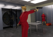 Talking about silly renders resulting from throwing different new stuff together for a test, here's one I once made. "Red Bathrobe Cheetahs Gang robbing a bank".