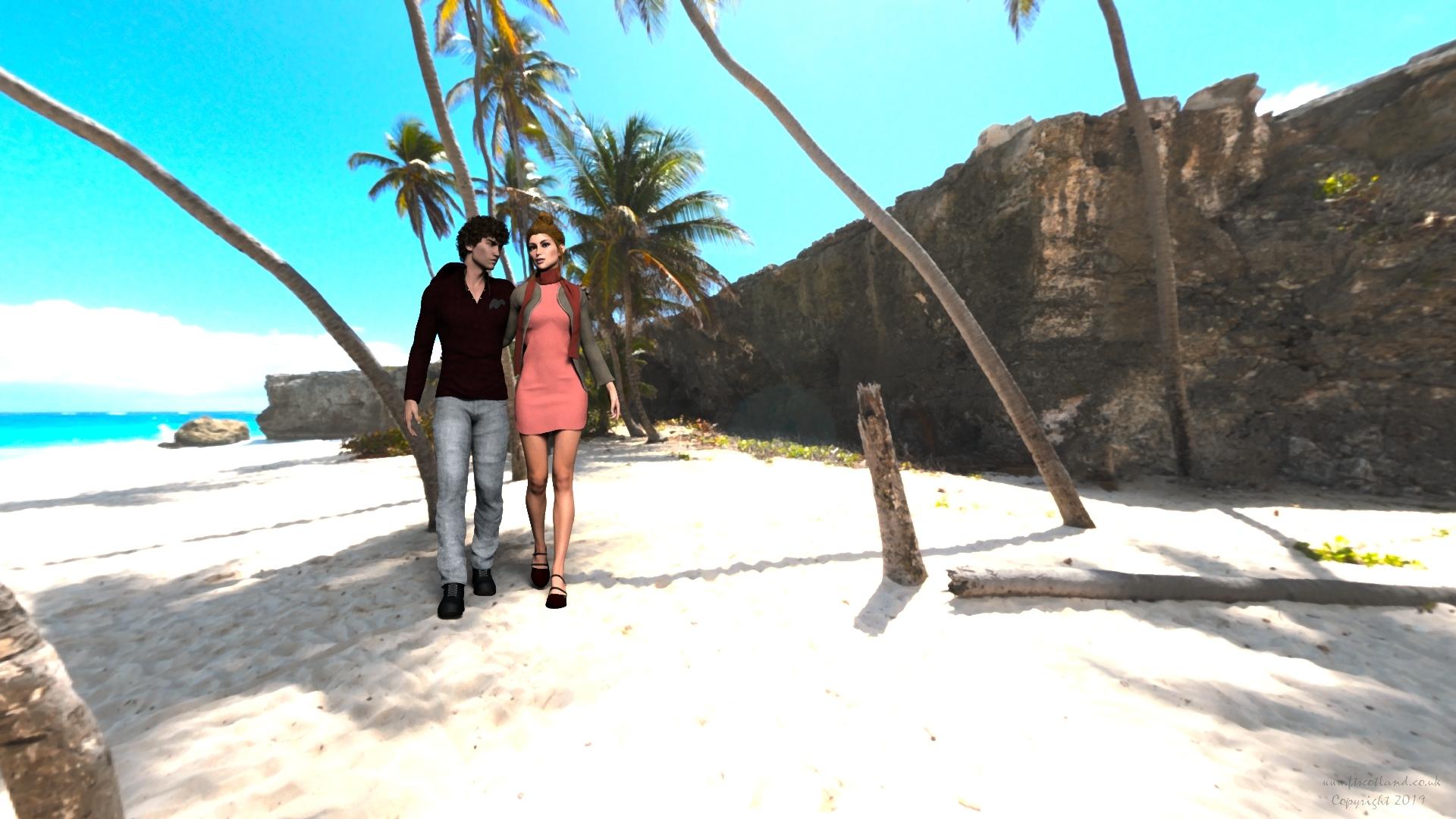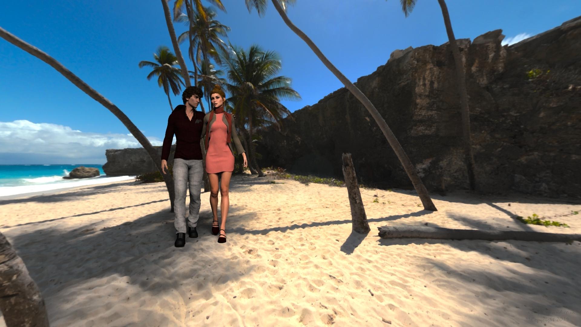 You can see that the sand, sky and sea are all blown out. I dropped a billboard which looks pretty well lit. Now you could adjust the Tone Mapping to make it darker and bring back the sand texture but that makes the billboard dark. I know they are in shade but they look better with some light. What I did was lower the Environment Light to 0.5 and the Environment Map to 1.5 which brought out the sand texture. I added a 1 Meter plane and set it to Emissive, Colour=White;Temperature=4500;Luminance=35.00;Units=cd/cm2. I pulled it up and to the right of the couple and angled it to face down to try to imitate the sun which is coming from that direction going by the shadow of the tree. I then adjusted the size of the plane to soften the light, it went about 200+% for this image.