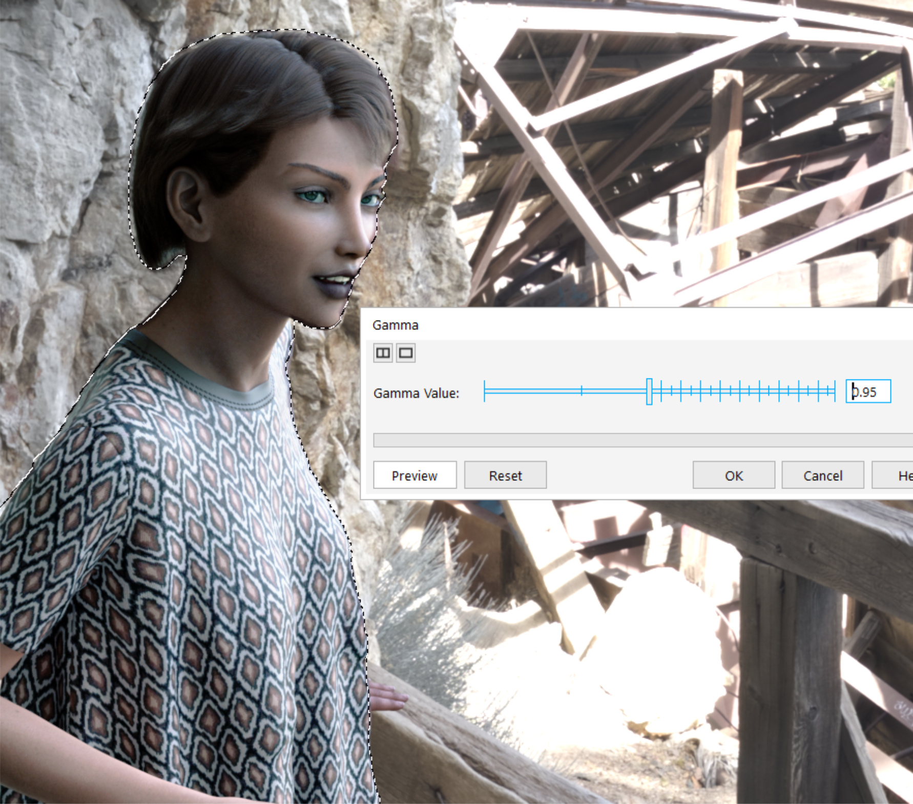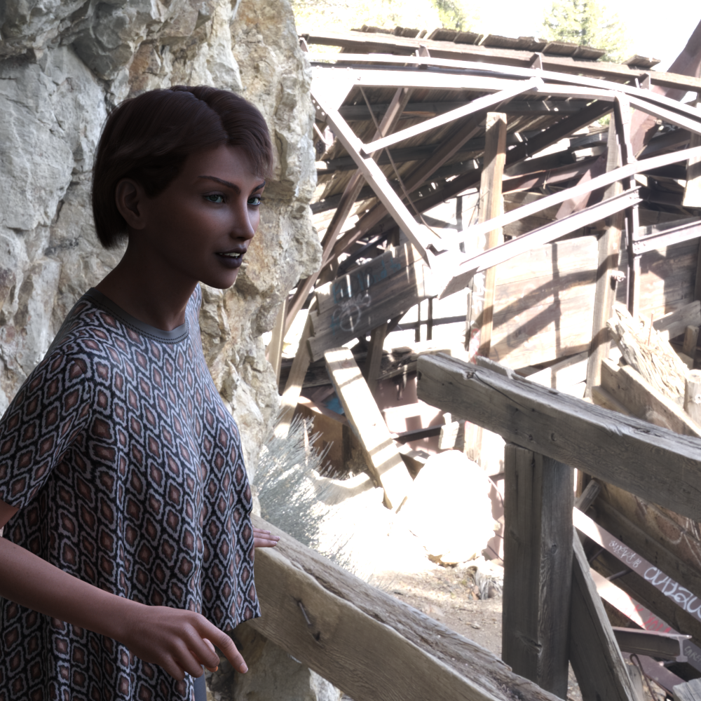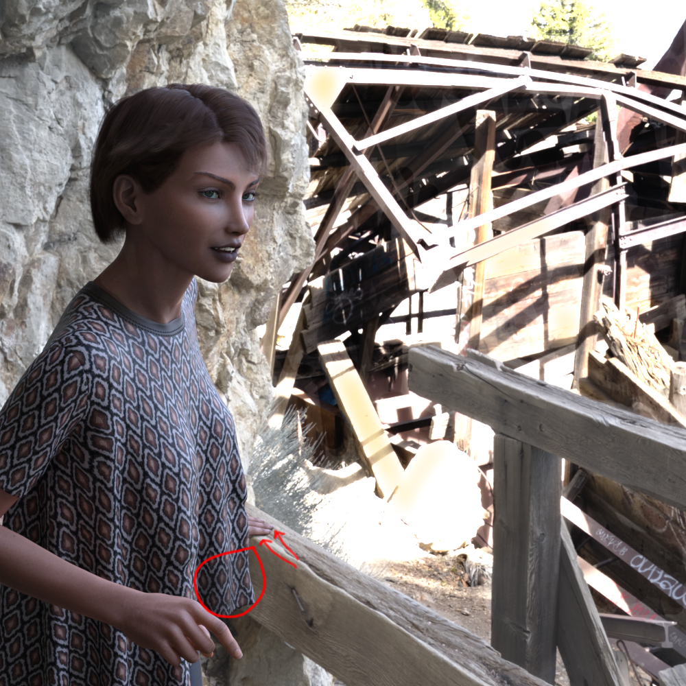 Tip: After doing the Tone Curve, I added shadows to the fingers on the rail, and darkened slightly the front of the shirt where a shadow would be from the railing. So add shadows from the HDRI images which aren't really there in 3D. If your hand is "on" something, add a shadow. If something is blocking light from "being there" do a shadow on the person.
