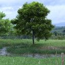 I did the renders above with no other environmental components so as to focus on the trees themselves. This next render combines a sessile oak with the Pond Field scene from Modular Field Environment, and older product I got during November sales. They go together quite nicely even though the render times are dramatically longer given all the transparency used in the grass. Render time as 49 min.