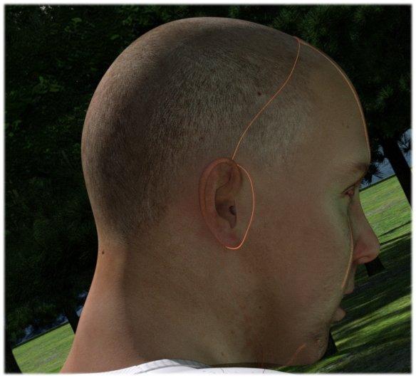 or, is there perhaps a geoshell in use there? Because as Sandy is suggesting with mentioning displacement & bump, the outlined face part seems to be a visible distance above the rest of head...