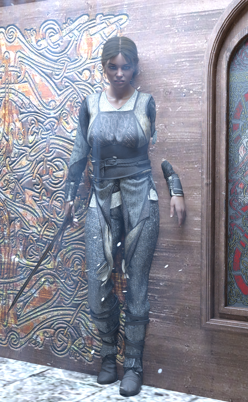 @Alex86fire, I used the https://www.daz3d.com/character-converter-from-genesis-2-female-to-genesis-8-female-, first moving Olympia 6 since Destiny's morphs are based on her and then Destiny herself. The outfit is PC+ https://www.daz3d.com/shieldmaiden-for-genesis-2-female and there are Genesis and Genesis 2 versions. I converted it up to Genesis 8 a while back, as the whole series is one I highly admire. I tried poses with the lhttps://www.daz3d.com/the-legend-for-genesis-3-and-8-female-s, but the outfit just looked wrong. Deleted the sword, found a walking pose and I took a chance and tried dForce. When it got to three notches below completion, it exploded. So I moved it back, and kept the pose as it was. And stared at it. Added the PC+ https://www.daz3d.com/celtic-great-hall and put the Legend sword back in her hand, then moved her back into the wall. My idea is she is immaterial at this point, like the X-men Kitty Pryde/Shadowcat. I do want to try the outfit again, with some attention to weight-mapping the bottom edges or something.