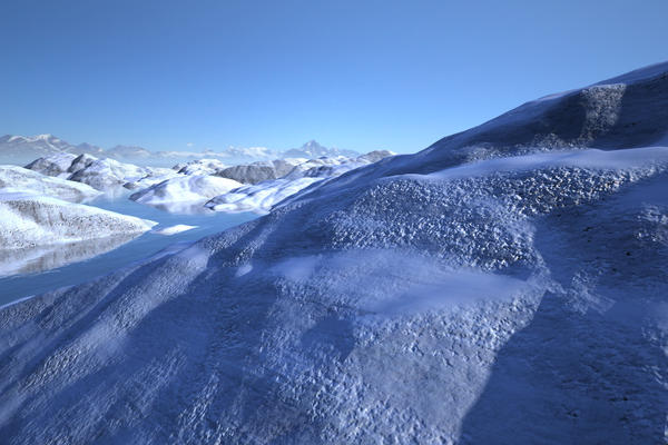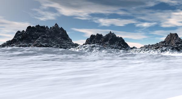 Dragonsbain/ SYKYDD you've created a strong mysterious atmosphere and the icy ground looks very convincing - interesting using slightly translucent material because that's what such terrain/snow/ice may have. It also seems to add a "shifting" feeling as if a strong wind is blowing some thin snow across the ground.