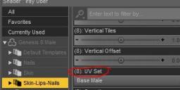 Select the character in the Scene Tab, and the Skin-Lips-Nails option in the Surface Tab, then you can scroll down to the "UV Set" and select a different UV set. In this case it should be Base Male, I think.