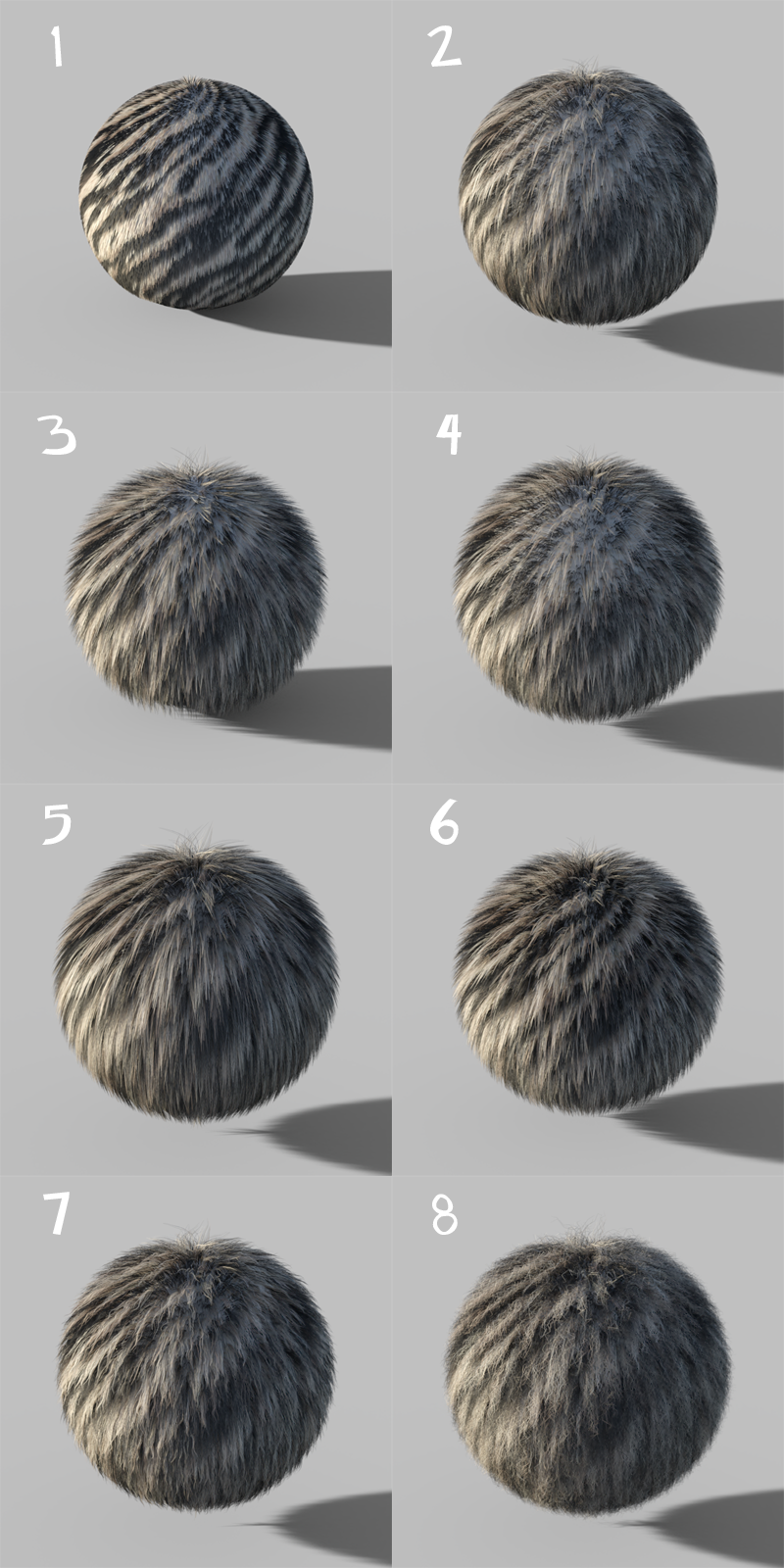 While trying to wrap my mind around all of that, I've been spending my free 3D time getting my hair on. I know this is OT for this thread, but hopefully the OP won't mind lol. Anyway, I've been busy creating new tools & procedures to make strand based hair (focused on animal fur). Here's a reference I made for my own use that shows the base styles which are possible so far: